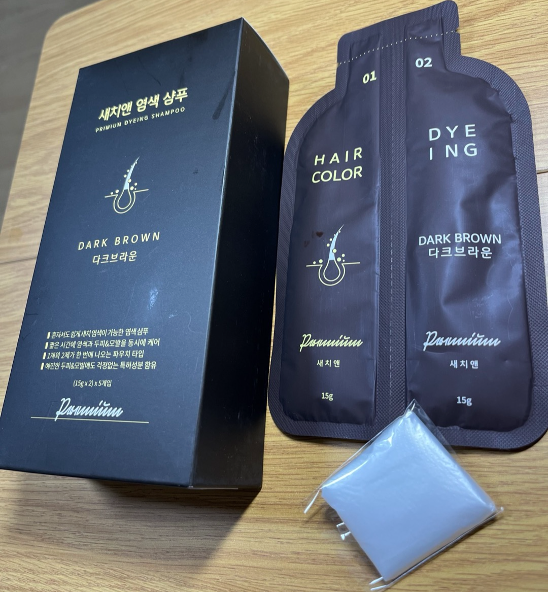 제품은 1제와 2제가 한번에 파우치로 포장되어 있고, 한 박스에 이 파우치와 비닐장갑 5개가 포장되어 있습니다. 한번에 염색이 되니, 굳이 매일 이 샴푸를 쓰지 않아도 되고, 다소 긴 출장이나 여행을 가게 되더라도 한 팩을 갖고 가면 부담없이 사용할 수 있을 것 같습니다.