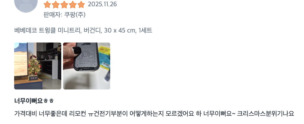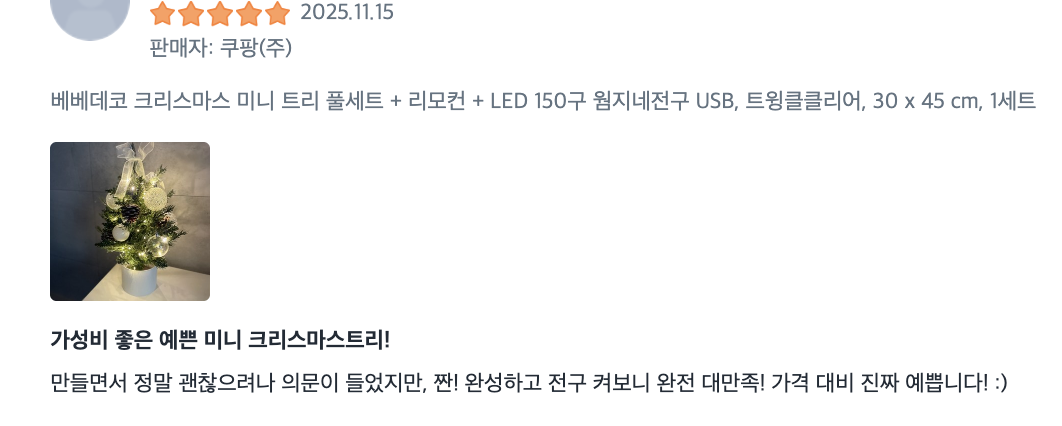 현재 별점 4.7점, 리뷰 588개를 가진 베베데코 크리스마스 미니 트리 풀세트 + 리모컨 + LED 150구 웜지네전구 USB, 트윙클클리어, 30..., 1세트! 지금 쿠팡에서 더 저렴하고 다양한 소품(인형/스커트/보